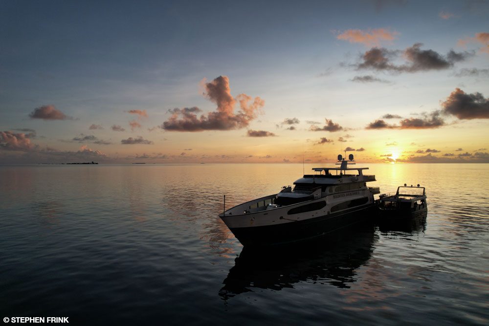 The country is so vast in terms of marine attractions that you can’t go wrong no matter where your liveaboard sails. The archipelago is spread over nearly 35,000 square miles (90,650 square kilometers), running more than 510 miles (821 kilometers) north to south and 80 miles (129 kilometers) east to west. As you move away from Malé, you can choose among popular itineraries, including Ari and Rasdhoo Atolls or perhaps Baa Atoll, which is famous for the scores of manta rays often in residence at Hanifaru Bay between July and November. Or you might head south to catch Mulaku, Vaavu, and Kolhumadulu, which is what we did on my 2016 trip to the Maldives.