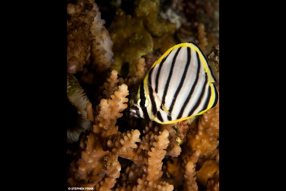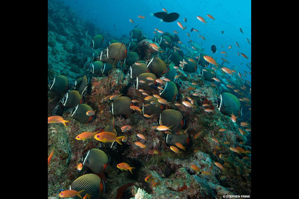 One extreme channel dive was enough for me. When it was time for the next dive, I wanted to know the options and asked the crew about what looked from topside like a sloping reef. It was a random spot they had rarely dived, but for a healthy reef and colorful reef tropicals, this turned out to be one of the best dives of the trip. The ubiquitous clown triggerfish was also here, but because the reef was so pristine, the backgrounds were awesome. I had a great series with very approachable regal angelfish before moving to longsnout butterflyfish doing what they are anatomically designed to do: poke inside tiny coral fissures to feed.