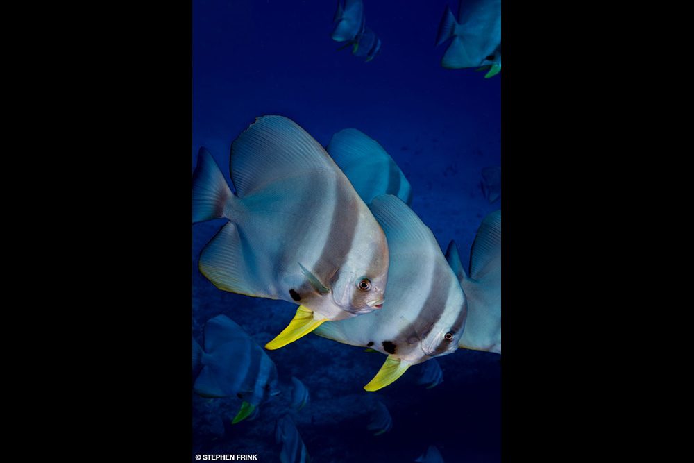 One of the best dives of the trip was on the last morning. Some of our group chose to sit out to offgas, although we had more than 24 hours between the dive and our flight. We had returned to anchor just off Malé, and there is a dive called Fish Tank that originated with local restaurants dumping their fish carcasses off the dock. As the dive evolved into a productive site, local snorkel and dive boats would often chum the water as a piscine enticement. The most noticeable beneficiaries of this largesse are the moray eels. Countless morays are in nooks and crevices along the bottom, and it is common to see two or three species of eels cohabitating in a single reef recess. It was so good there I dived it twice, once with a 16-35mm wide-angle lens to capture the large school of Moorish idols and models posing before immense honeycomb morays, and later with a 50mm macro lens to take advantage of all the easy fish portraits.