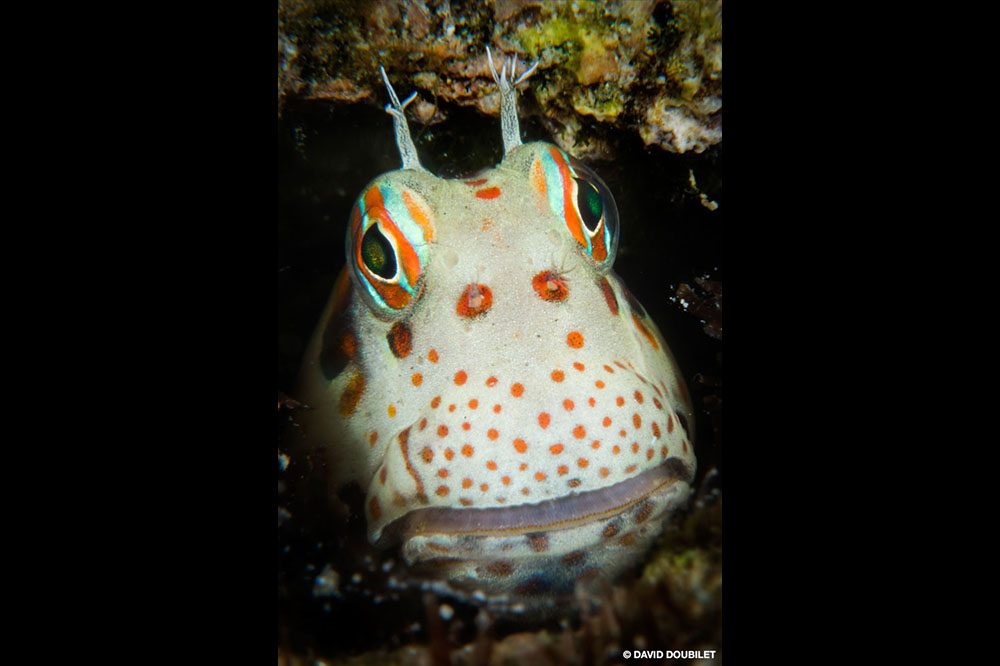 A small fish unknowingly drifts over an absolutely still stargazer waiting to ambush an evening meal off Anilao. ©JENNIFER HAYES AND DAVID DOUBILET