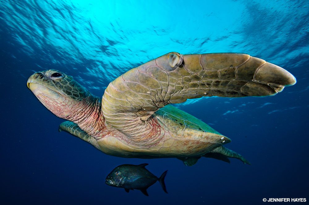 A hawksbill turtle feeding in the shallows off South Atoll in Tubbataha looked up and became obsessed with its reflection in the camera dome. ©JENNIFER HAYES AND DAVID DOUBILET