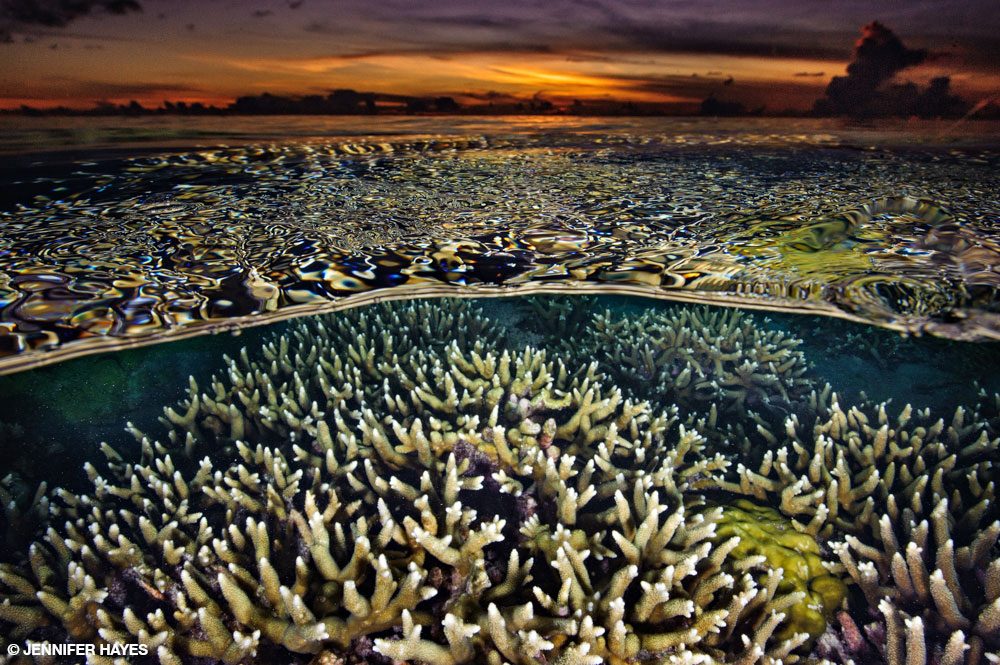 Sunset casts a golden glow across the coral-rich shallows on North Atoll in Tubbataha Reefs Natural Park. ©JENNIFER HAYES AND DAVID DOUBILET