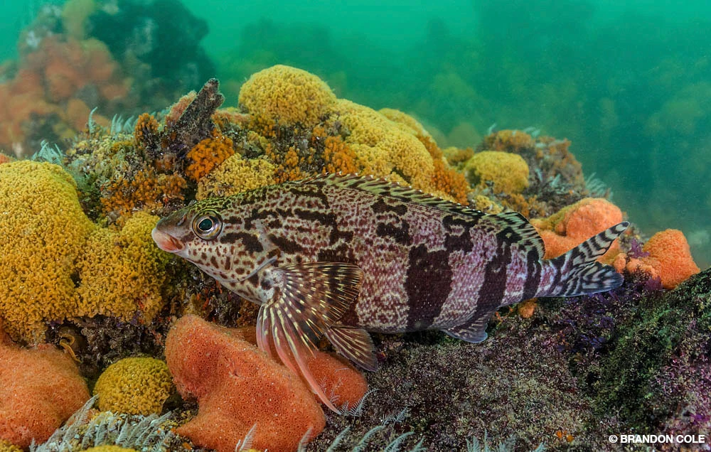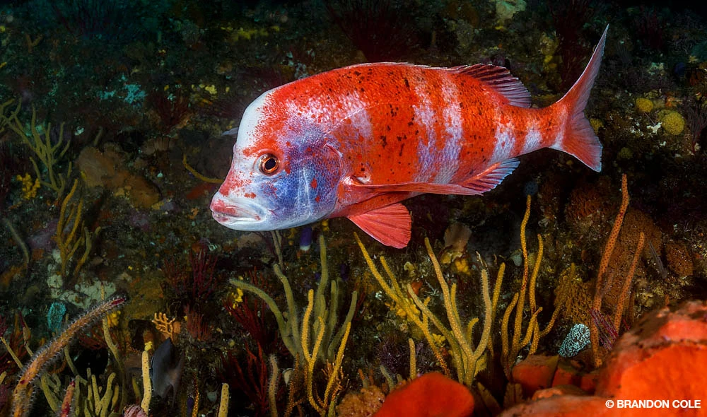 The visibility is a modest 15 to 20 feet (4.6 to 6 m), and the water is 62°F (16.7°C). The brightly painted seascape makes it seem warmer. Within no time we are exploring a Dr. Seuss’ garden of gorgonians and sponges and meeting cool critters with catchy names such as the red stumpnose (Miss Lucy fish) and Cape knifejaw. My wife, Melissa, spots an octopus, but I struggle to line up a clean shot because of the dense polychrome invertebrate jungle. A red roman — a large and handsome fish in the seabream family — comes over to hover above me, hungrily eyeing my tasty calamari subject. The octopus proves too clever for both of us, however, and slyly disappears into a hole in the reef. I am more successful photographing an exquisitely tattooed leopard catshark and a pair of silvertip nudibranchs.