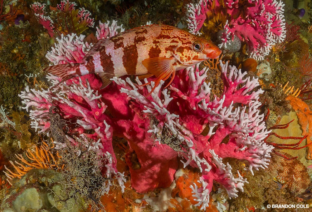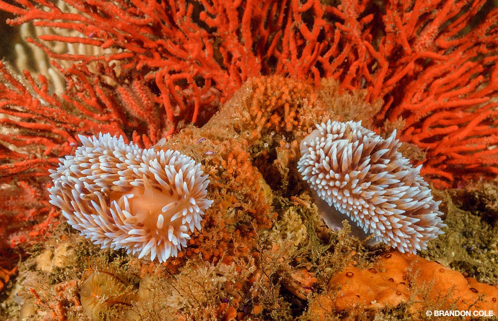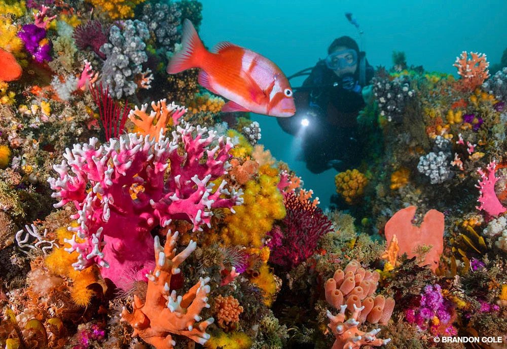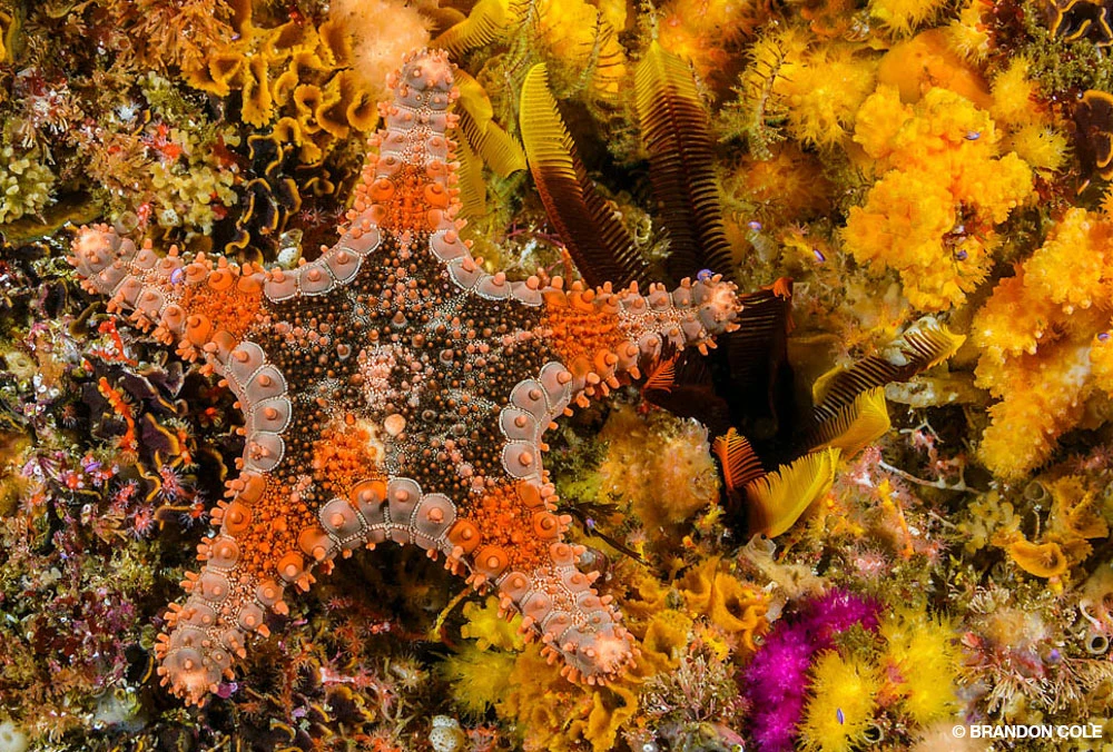 Thunderbolt’s colonies of noble coral in bubblegum pink, salmon, and fuchsia remind me of the hydrocoral I have fondly photographed half a world away near Monterey, California. A redfingers fish — named for the long, claw-like, scarlet rays extending from its pectoral fins — perches atop one colony. There are purple octocorals that resemble clusters of grapes, frilled nudibranchs eating soft corals, and sea stars I’ve never seen before. Klipfish scoot about mounds of bryozoans, sea catfish lurk under ledges, and doublesash butterflyfish sidle up next to sea fans. The ocean’s most visually striking basket stars grip tightly to some of the fiery fans. So many fish and invertebrates here at the bottom of the world are endemic, living nowhere else on the planet.