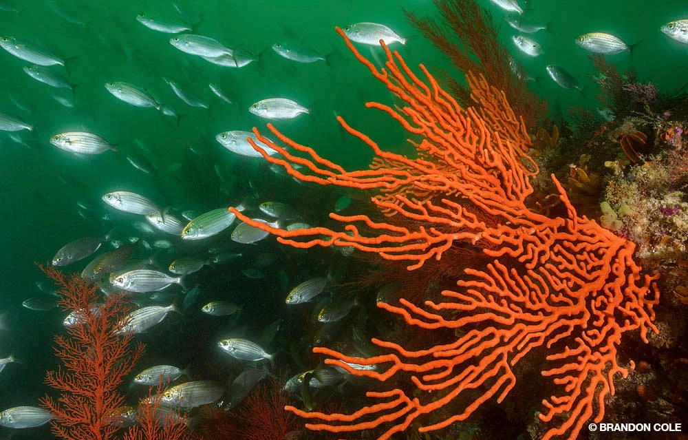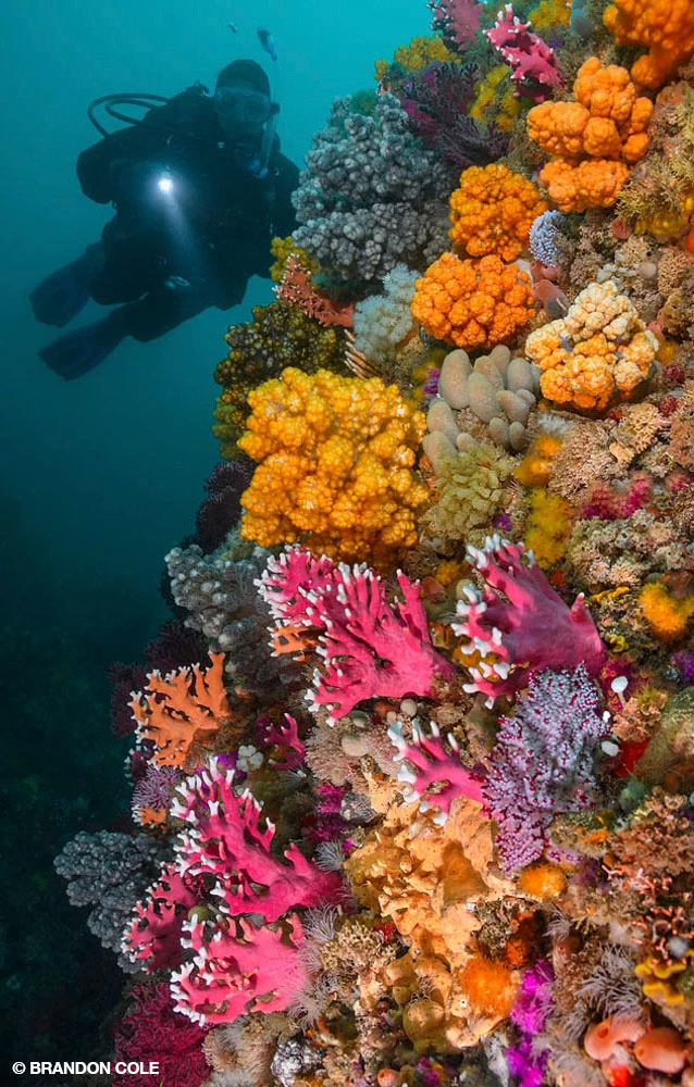 We give the point and its calamitous past a wide berth and arc around to Thunderbolt Reef, where a collection of pinnacles rises from the seabed 80 feet (24 m) below. The site’s spikey profile contrasts with the broad seamounts we have explored so far in eastern Algoa Bay. The marine life decorating the spires is also subtly different. Cauliflower-shaped clumps of soft corals in yellow, orange, and an unusual gray sprout from the pinnacles’ sides between 60 and 80 feet (18 and 24 m). I don’t remember seeing these at Riy Bank or Evans Peak.