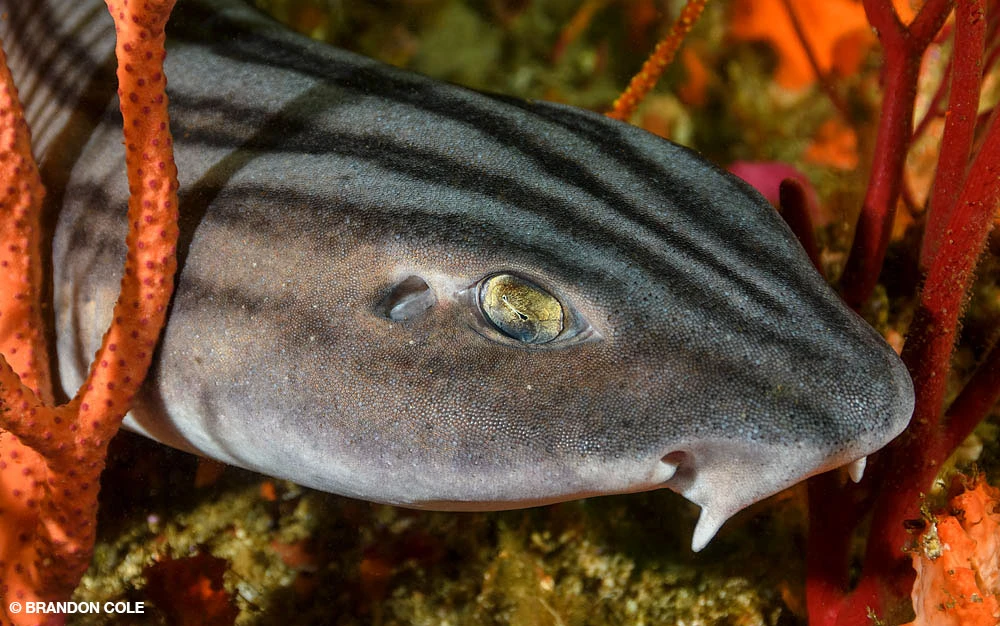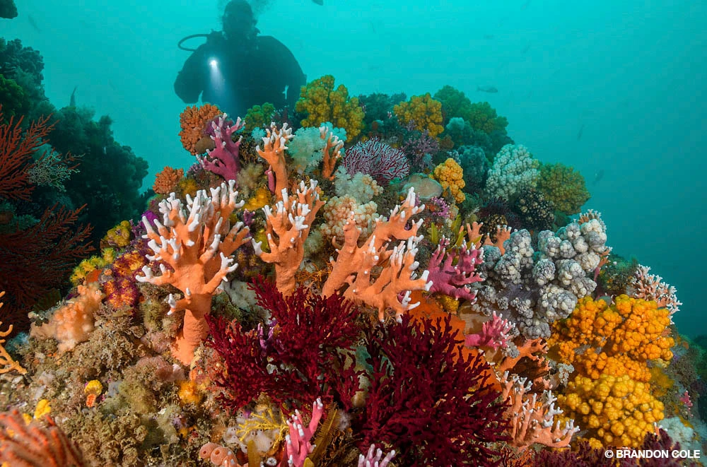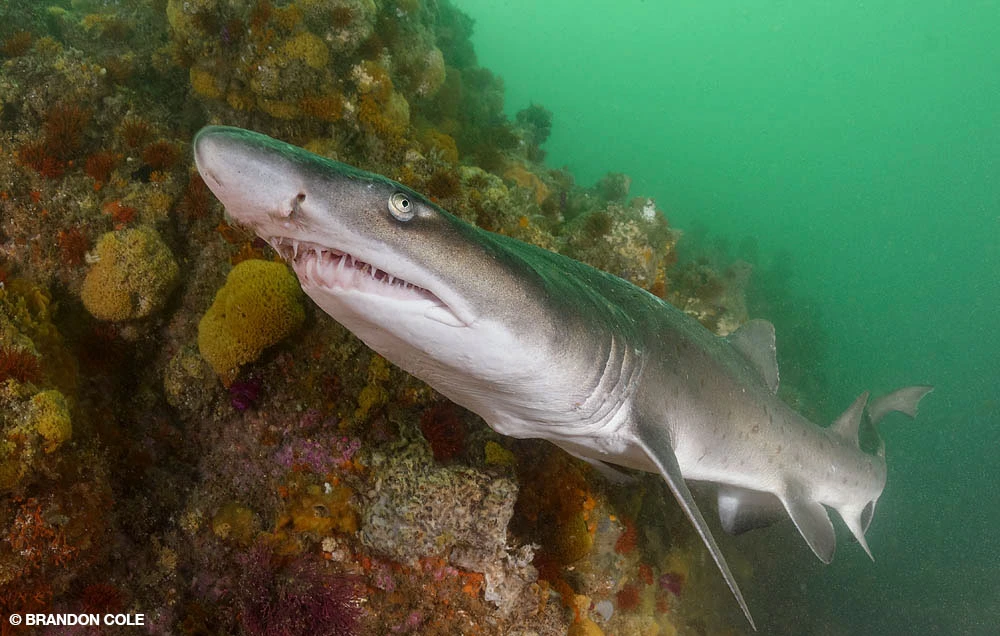 The scenery under our fins is fantabulous. Sea fans and whips stretch to the horizon, swaying overtop sponges and bryozoans. Evans Peak is a riot of intense colors — red, yellow, purple, and orange. The artful tangle of life is lush and luminous and looks like a rainbow of flames dancing against a jade-colored dusking sky. Goggle-eyed, silvery fransmadams glint and shimmer as they swim along the tableau, while other, more cryptic fish are tucked in the branches of gorgonians or resting on the rich turf. A 3-foot (1-meter) pyjama catshark slither-walks through apricot and burgundy whips at 65 feet (20 m) deep. We slip down to 80 feet (24 m) for a fleeting glimpse of a retreating ragged-tooth shark. Thankfully, we will have many more encounters with this creature in the coming week.