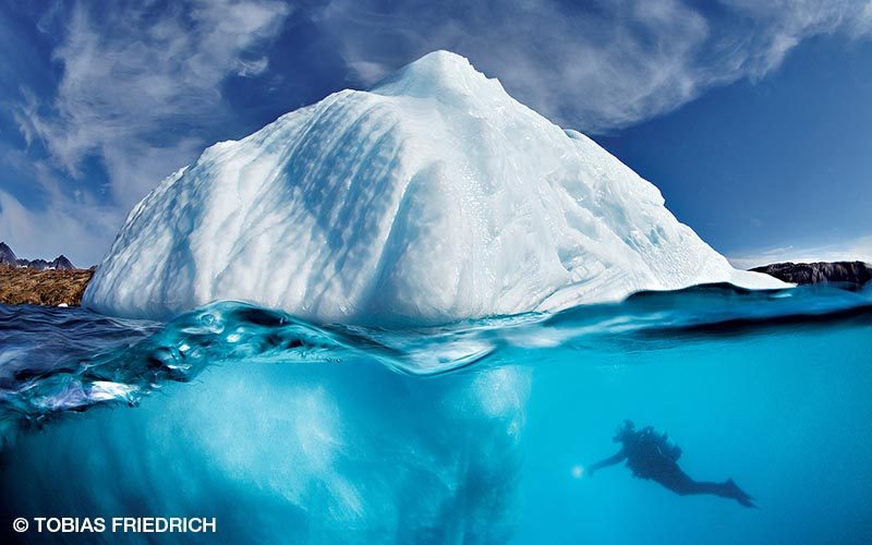 I took this image during my first expedition to Greenland. It was summer, and the ice and icebergs were rapidly melting. This iceberg was in the bay near where we stayed in East Greenland. As we approached across the small fjord, we realized the algae bloom made the visibility poor. Before we went diving, I wanted to take a split shot of the iceberg from the surface, but the freshwater layer on top made it difficult to get a nice shot. I had to get very close to the iceberg to see its structure as well as the other diver in the image.