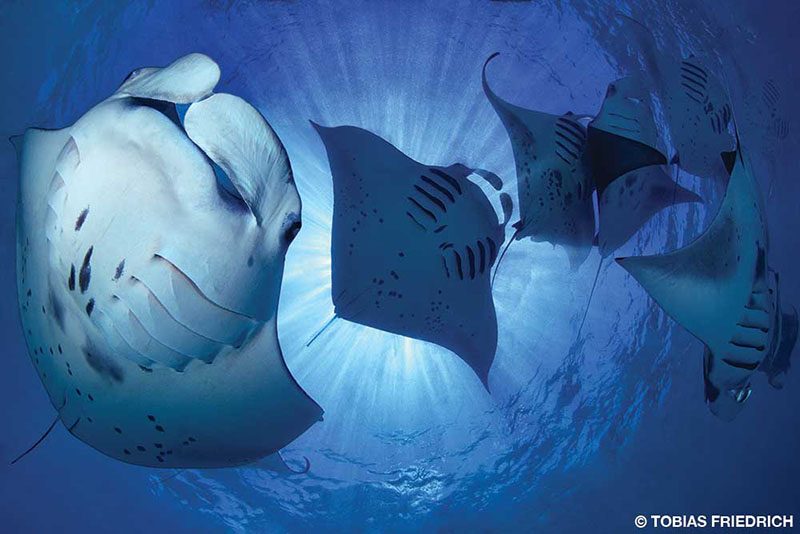 Reef manta rays come together to feed at this protected area, especially after the full moons between August and October, when the plankton aggregates are especially high here. After taking some photos, I changed my perspective to get something different for my portfolio. My plan was to get a manta from below with the sun rays coming from behind. Luckily there was not one but nine mantas swimming in the right direction to get the shot I wanted. Scuba diving is no longer allowed in Hanifaru Bay, part of the Baa Atoll UNESCO Biosphere Reserve, but some snorkeling tours are available. I took this photo when the area was still open for diving.