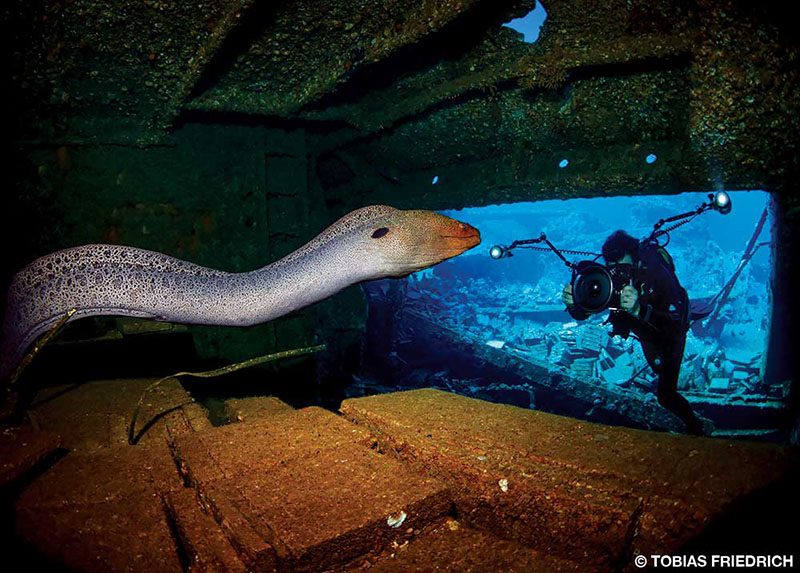 I was waiting inside a room in the Chrisoula K wreck for another photographer to finish so we could continue the dive. A huge moray eel approached me from behind and swam into the cargo deck just a few inches away from my head. I was quite surprised and pointed for the other photographer to get a shot because he was in a better position than I was. He didn’t react, probably also too surprised to take a photo, so I took the chance and swam a few yards after the eel to get a few images before it disappeared further into the wreck. The other photographer in the picture was coming from outside the wreck to get a shot as well.