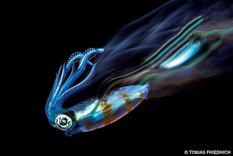 This reef squid checked out my camera during a blackwater dive in Bali, Indonesia. Usually the squids stay for a little while because they are fascinated by the light of the downline. They pause for a moment if you point your dive light at them, and you can get some images of them before they realize their situation and swim away. After taking some standard shots of this fellow, I wanted to try something different, so I set my shutter speed for one second to capture its movement. It’s not easy to find the right moment. You can’t see the squid’s movements while exposing because the camera’s shutter is up, but with patience and a little luck you can get a good shot.