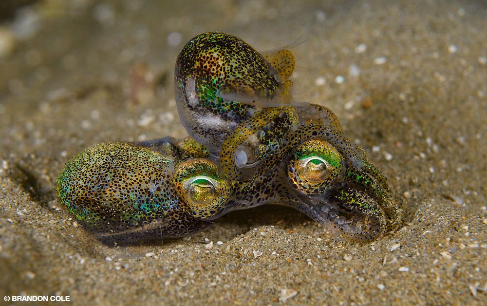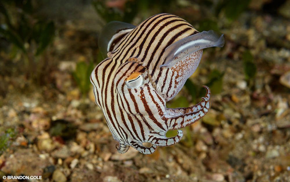 They are all marvelous beasts, but the striped pyjama squid deserves a special mention. It resembles a marshmallow with eyes and dressed in a prison suit. Glands on the underside of its chubby, 3-inch (7.6-centimeter) body produce a poisonous slime. The pyjama squid typically crawls along the sand but can swim jerkily through the water column by using jet propulsion, sucking water into its mantle cavity, and then forcefully expelling it.