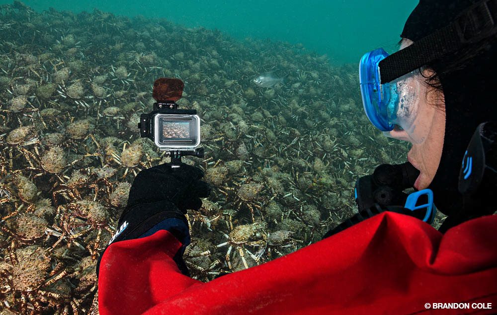 Above the waterline, people relax on the 925-foot-long (282-meter-long) concrete pier structure, picnicking, fishing, and pointing at sailboats. Most of them are seemingly unaware of the crustacean horde encamped 10 to 20 feet (3 to 6 meters) below the jetty. Two divers, however, excitedly chatter about spider crabs — and big-belly seahorses, giant cuttlefish, and more — while preparing their gear and donning thick wetsuits for the 54°F (12°C) water.