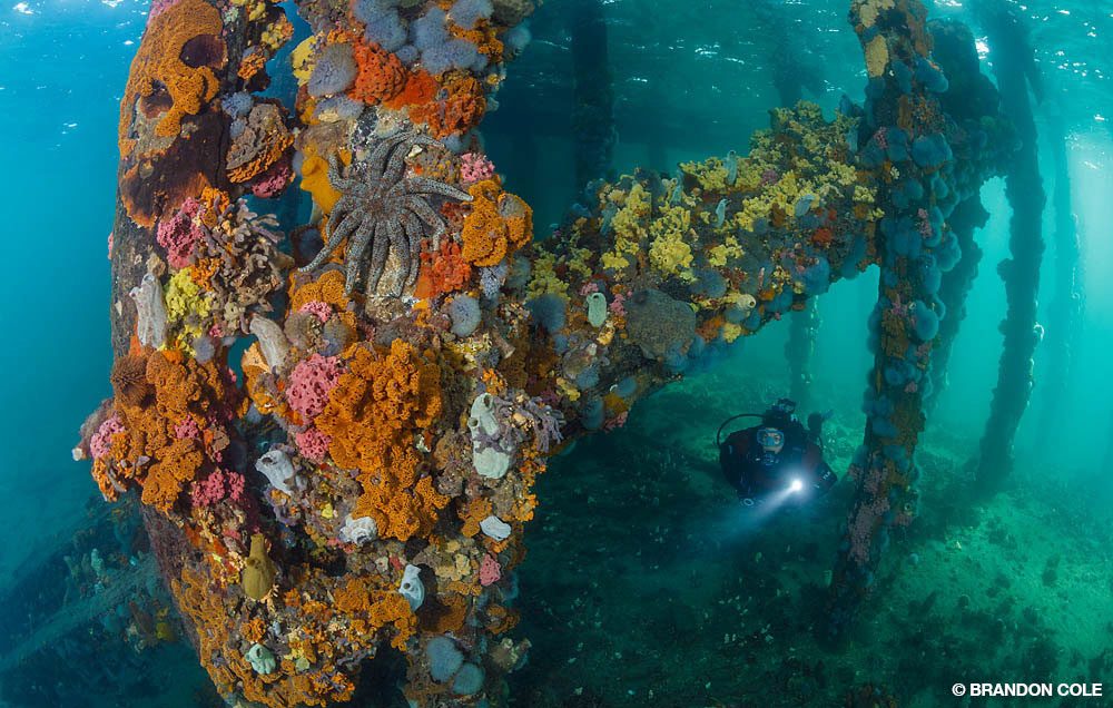 Pier structures transform flat or gently sloped, soft-bottom locations into more complex and ecologically dynamic three-dimensional habitats. The structure is the catalyst, the foundation on which the profusion of life is built. Rigid substrate such as rock, metal, and concrete is limited underwater and represents valuable real estate. Sessile organisms, including sponges, tunicates, and bryozoans, require a firm substrate for drifting planktonic larvae to settle out of the water, attach, and grow into their adult stages. The blended ecosystem of jetty and reef offers this benefit, allowing these organisms to flourish.