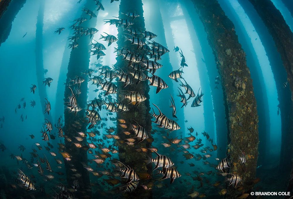Jetties are magnets for marine life and have become vibrant artificial reefs. An astounding array of invertebrates and fishes, from sponges and starfish to seahorses and cowfish, have colonized metal, concrete, and wood over time. Eclectic communities of sea creatures now call these unique, hybrid seascapes home.