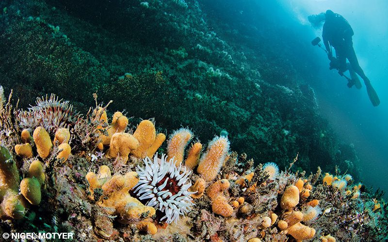 Moving further south along the coast from Donegal, it’s easy to find great sites on nearly any exposed headland or offshore island. Dropping below thick kelp beds that grow down to about 50 feet, divers can see steep, rocky drop-offs covered in colorful invertebrate life.
