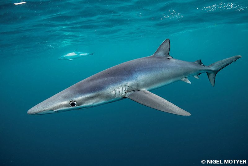 Initially curious, the basking sharks eventually got tired of us and sank into deeper water, so we resumed our journey to find blue sharks. Another disturbance in the water interrupted us as a large bluefin tuna exploded out of the water about 300 feet in front of the boat. A school of bluefin had corralled a school of herring against the surface and were charging through them, bursting out of the ocean in a mass of white water and scattered herring. We maneuvered the boat near the action, and two of us jumped in to try to take photos. Passing by in fleeting flashes, these huge fish proved too fast and wild for us to get decent pictures, but our spirits were high as we got back on board.