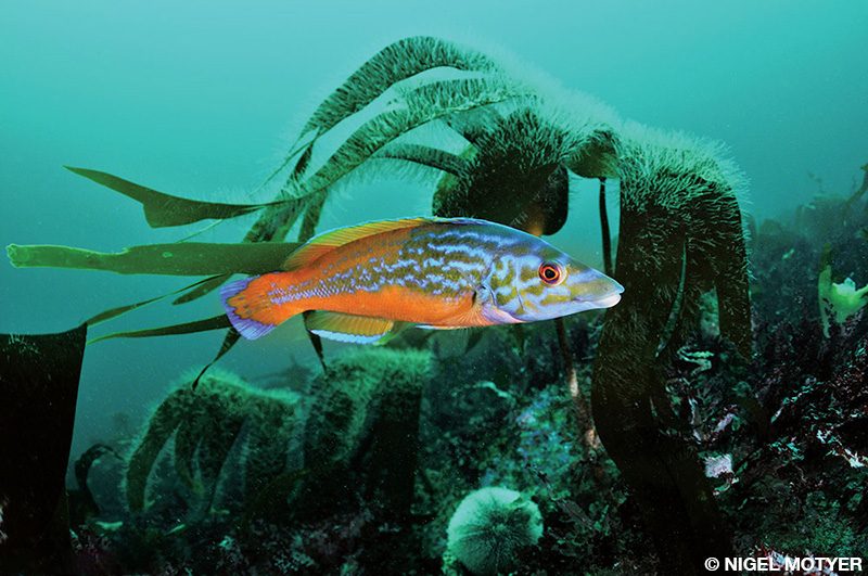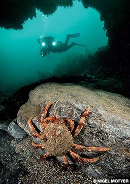 One of the best things about diving this ancient, wild coastline is when you fall through inky black water, clear your mask and see you have landed where the visibility is crystal clear — it feels like you can see forever. On those days, nothing is better than heading deep and feeling insignificant against the drama of a huge drop-off or the wild lunar landscape of a deepwater rocky slope.