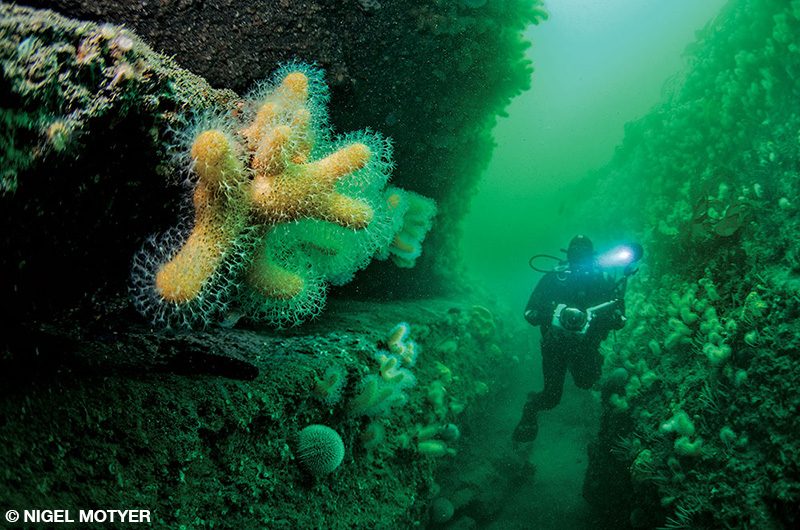 Along the border between counties Mayo and Galway runs Killary Harbor, a 9-mile inlet of protected water and Ireland’s only fjord. It is a busy site for Irish divers all year round, but the protection it offers from most weather makes it a popular winter dive site. The fjord’s shallow water, which allows an easy shore entry, quickly drops away into deeper reef structures where catsharks and conger eels are commonly found. The soft sediment provides homes for burrowing bright-orange Dublin Bay prawns, although the site is a long way from Dublin Bay. The well-equipped dive center here takes visiting divers both in the fjord and to the offshore island sites that are well worth visiting.