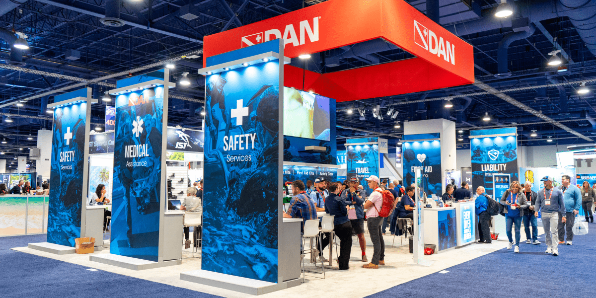 The booth also featured DAN Store products, showcasing emergency oxygen and first aid equipment alongside new lifestyle items.